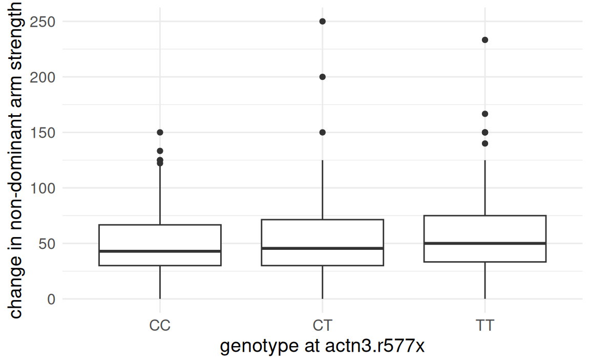 Question: Does change in non-dominant arm strength (ndrm.ch) after resistance training differ between men and women?